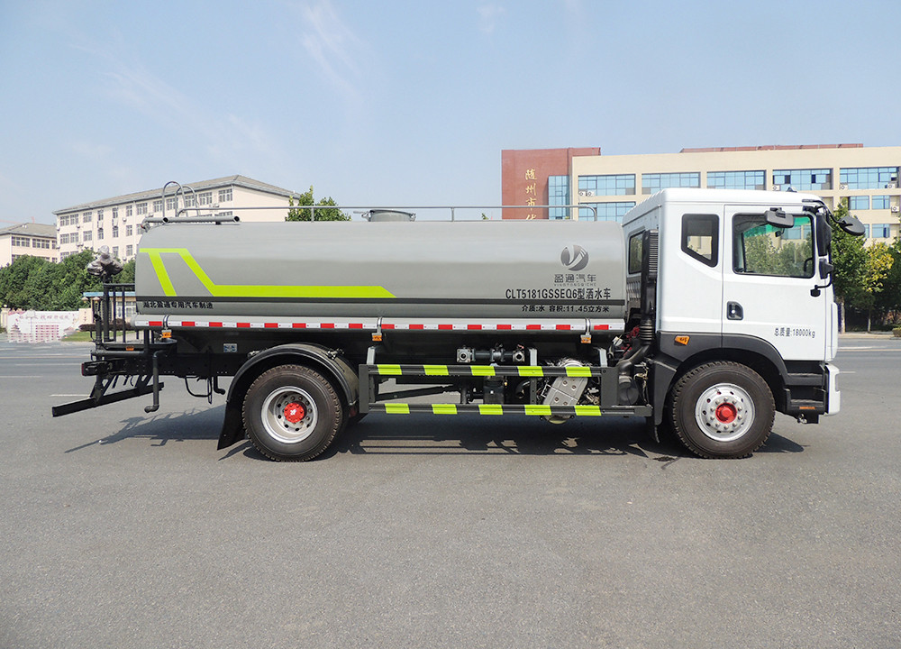 14方灑水車產品主要技術參數 序號 名稱 型號、規格 1 整車型號 CLT5185GSSEQ6 型灑水車 2 發動機型號 D4.0NS6B195 3 發動機馬力/功率 康明斯 195 馬力/143KW 4 發動機排量 4000ML 5 變速箱 法士特 8 檔(帶高低檔) 6 輪胎規格 10.00 鋼絲胎 7 軸距 4500 8 總質量 18000KG 9 整備質量 6900KG 10 額定載質量 10900KG 11 整車尺寸(長×寬×高) 8.45*2.5*3.2 12 罐體容積 14.2 方 13 燃料種類 柴油 14 排放標準 國六 15 水泵型號 60/90 16 罐體材質 Q235 碳鋼