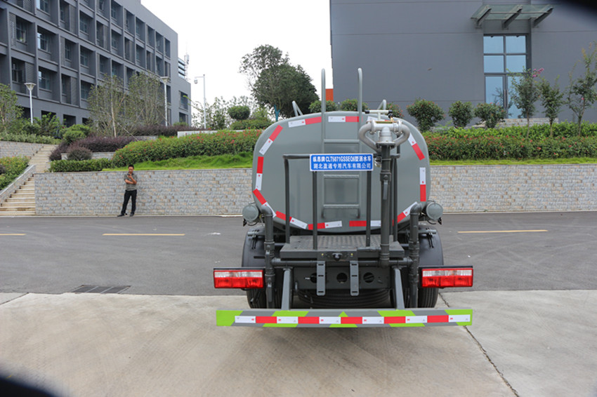 罐體容積 5立方,罐體采用國標Q235碳鋼材質,新式工藝罐體,罐體厚度4MM,前后封頭5MM加厚型,罐體內雙層隔板具有防波蕩作用,以減輕汽車行駛時罐內液體沖擊;灑水車整車及外形尺寸嚴格按照國家機動車公告制作而成;裝配大功率專用灑水泵,前沖、后灑、側噴、后平臺帶消防式灑水炮,灑水炮可全方位旋轉,可連續調成直沖狀、大雨、小雨、毛毛雨;配消防接口,自流閥,濾網,帶自吸自排功能。前封頭帶水位計,后平臺主管路帶1寸澆花接口,后爬梯,帶1個消防接頭,帶1個自流閥,1個過濾裝置,其余標配。1、可選裝后平臺帶霧炮機組用于噴霧降塵、農藥噴灑作業;2、可選裝前置電子灑水炮駕駛室操作;3、可選裝氣動球閥駕駛室操作。