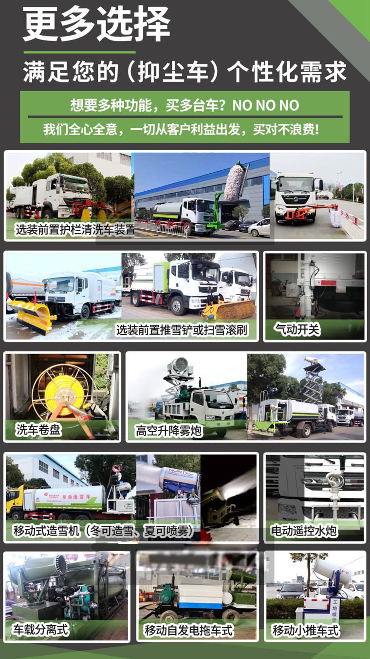 底盤參數:采用國六東風D9底盤,公告型號:CLW5180TDYD6型多功能抑塵車,顏色按公告色,4500軸距,玉柴200馬力,1000R20輪胎,帶備胎,帶空調,ABS,法士特六檔箱。