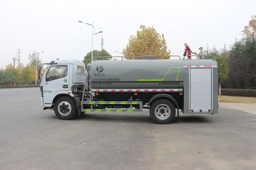 灑水車裝置:罐體容積為8立方,罐體材質為4mm碳鋼Q235材質,罐內隔板具有防波作用,以減輕汽車行駛時罐體液體沖擊,罐體及整車外形尺寸嚴格按照公告制作。帶大功率專用灑水泵,泵可自吸自排,整車前沖、后灑、側噴、帶65消防接口,前封頭帶水位計,罐體一側帶爬梯。帶兩根水管及陰陽端。罐體上可選配帶綠化灑水炮,灑水炮可全方位旋轉,可連續調成直沖狀、大雨、小雨、毛毛雨罐體顏色:上白/下藍或太陽紅,罐體兩側噴“灑水車、消防灑水車”字樣,貼反光標示;消防灑水車一車兩用,即可用作消防車,同時用于綠化灑水車,需要時還可作噴藥車使用,是一款多功能型消防車。