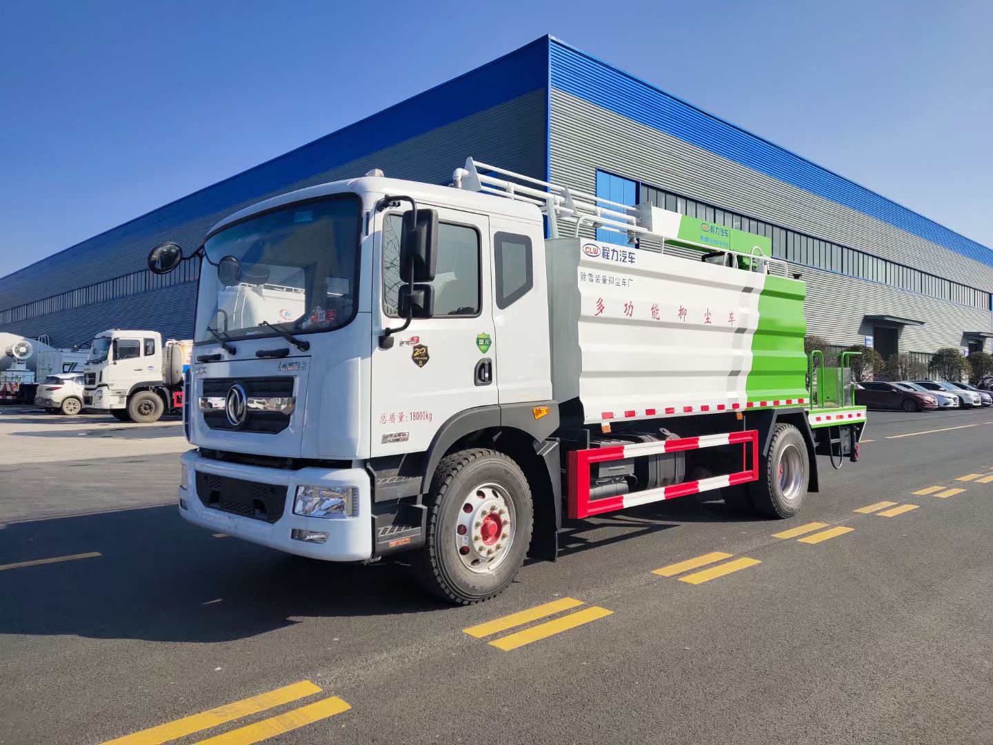 多功能抑塵車主要結構是在行走機構上加裝方型大容積水罐、高效遠程霧炮系統、大功率專用自吸自排水泵,中低壓沖洗灑水系統、綠化灑水高炮(可選裝自動灑水高炮,在罐體前端)等等而改裝組成。、罐體容積大(14立方),免征產品