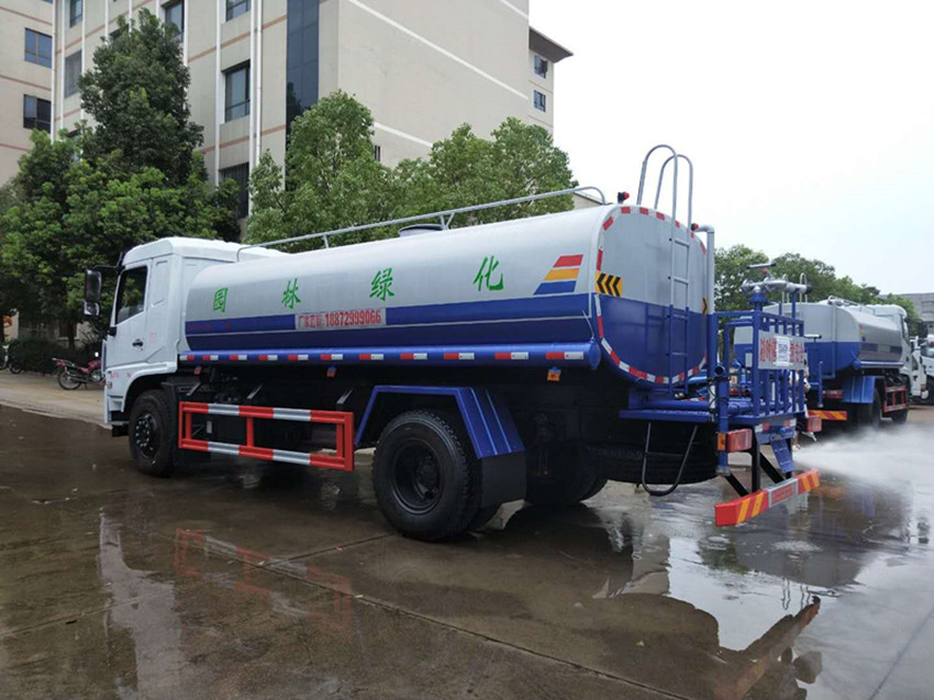 灑水車性能簡介;吸程≧7米,灑水寬度≧14-16米,射程≧25-40米,引水時間<5min,流量60m3/h。前沖(噴)、后灑、帶側噴(花灑)、帶后工作平臺、平臺上安裝綠化灑水高炮(炮噴射形狀可調節:直沖、大雨、中雨、毛毛雨、霧狀、可連續調節,360°旋轉),配消防接口,自流閥,濾網,帶自吸自排功能。配備大功率專用灑水泵,泵可自吸自排,安裝過濾網,帶消防接口,可通過消防栓進水,帶自流閥,隨車選裝20米綠化卷盤,可噴灑農藥,罐體金屬漆。罐體有橢圓和方圓罐兩種,可根據用戶的要求定做。
