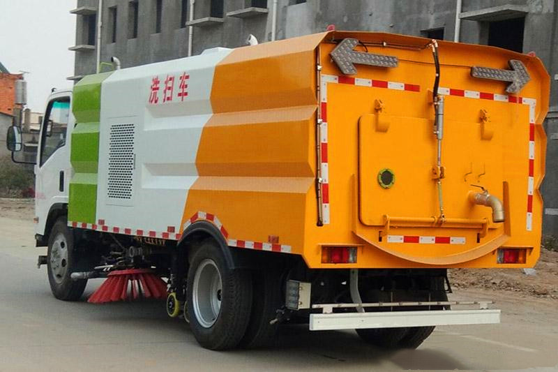 11、五十鈴700P洗掃車|五十鈴5噸多功能洗掃車的垃圾箱內帶有自潔功能,在垃圾傾倒完成后可將箱內的殘留垃圾沖洗干凈,減輕環衛工人的負擔。