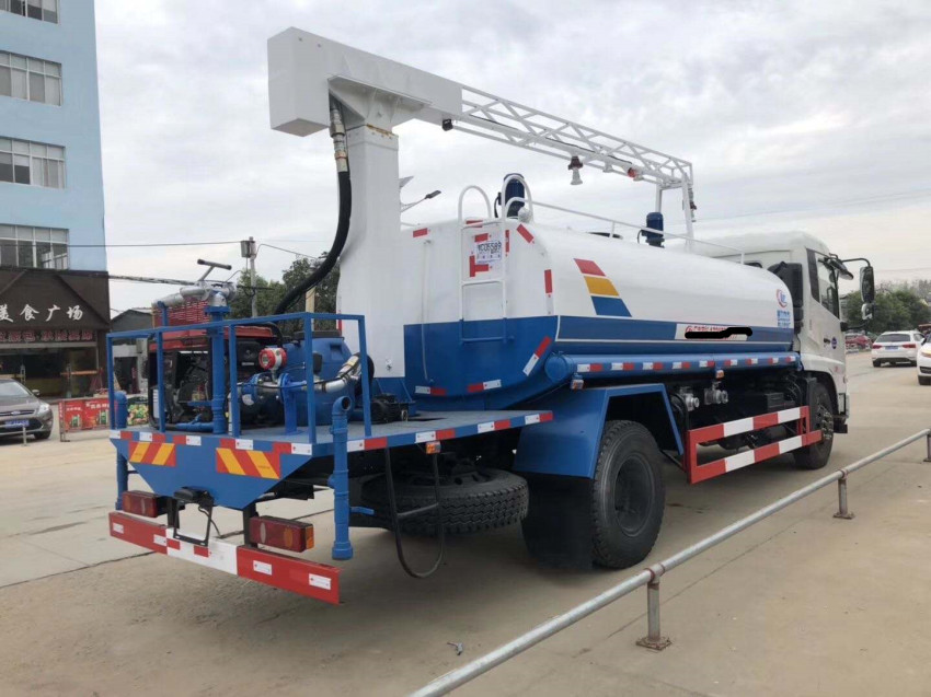 抑塵車上裝配置:罐體為4.5方方形罐,前沖、后灑、側(cè)噴、高炮,抑塵噴灑桿(帶旋轉(zhuǎn)伸縮功能)。噴灑桿離地3.5-4.5米 ,后部平臺帶8KW副發(fā)電機組,罐體內(nèi)部加兩個1.5KW電動馬達(帶攪拌功能)罐體噴漆上白下藍,平臺和噴灑桿藍色。遙控操作噴灑桿上下左右旋轉(zhuǎn),電控箱安裝在后部平臺。