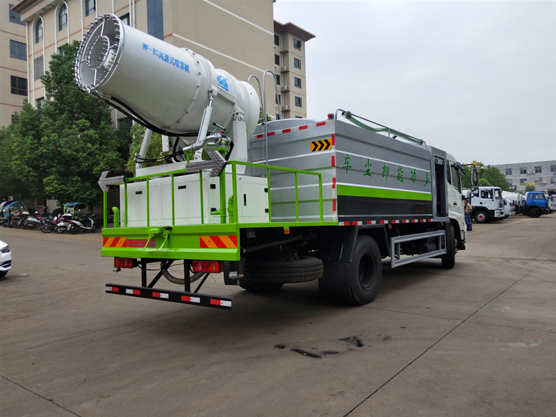 抑塵車吸程≧7米,灑水寬度≧14-16米,射程≧25-30米,引水時間<5min,流量60m3/h。前沖(噴)、后灑、帶側噴(花灑)、帶后工作平臺、平臺上安裝綠化灑水高炮(炮噴射形狀可調節:直沖、大雨、中雨、毛毛雨、霧狀、可連續調節,360°旋轉),配消防接口,自流閥,濾網,帶自吸自排功能。配備大功率專用灑水泵,泵可自吸自排,安裝過濾網,帶消防接口,可通過消防栓進水,帶自流閥,此車尾部帶大功率噴霧炮,霧炮射程可選裝50-100米,帶獨立柴油發電機組。