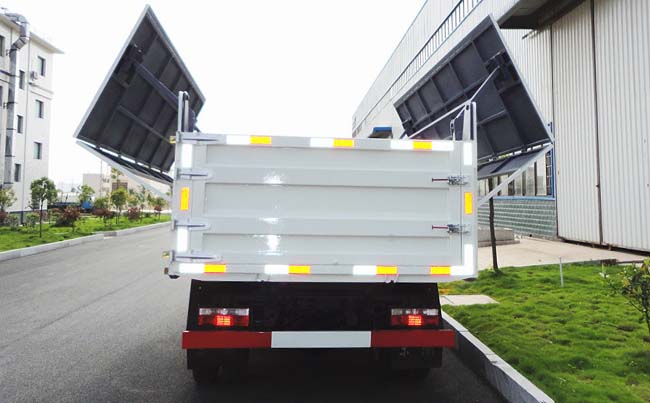 箱體容積7~8立方米,自卸式箱體,箱長4.3米,箱寬1.95米,箱高0.8米,采用4毫米厚鋼板制作,箱頂帶液壓蓋板,可向兩邊展開折疊,箱底雙缸液壓自卸,手動尾門。